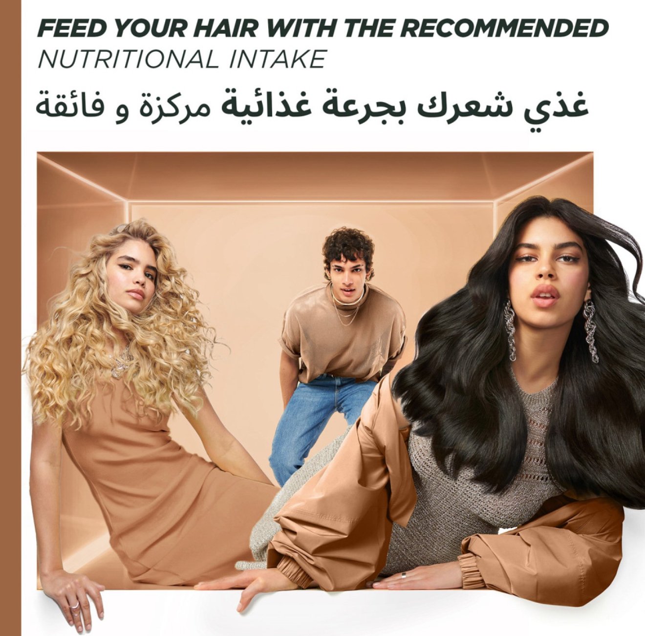 يتميز بتركيبة غنية بمستخلصات الأغذية الفائقة للشعر لترطيب عميق يدوم طويلًا.