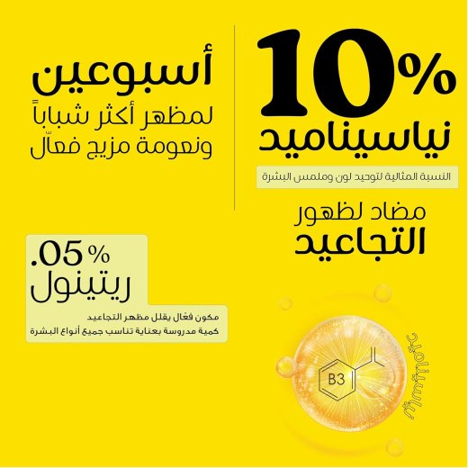 سيروم بيزلين للنضارة ومقاومة التجاعيد هو سيروم فعال يجمع بين 10% نياسيناميد لتفتيح وتوحيد لون البشرة مع 0.05% ريتينول (تركيز مناسب للمبتدئين) لتجديد البشرة وتقليل التجاعيد. يساعد على تحسين ملمس البشرة وتقليل الخطوط الدقيقة ومنحها إشراقة ومظهر أكثر شبابًا مع الاستخدام المنتظم.