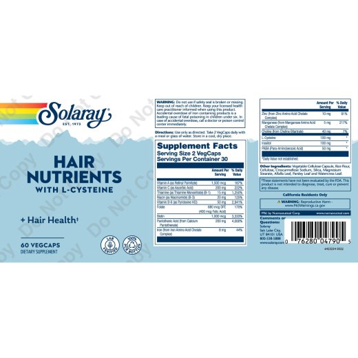 مكمل غذائي من Solaray يحتوي على تركيبة متوازنة من الفيتامينات والمعادن مع حمض ال سيستين، المصمم لدعم صحة الشعر وتقويته. يساعد هذا المزيج على تغذية بصيلات الشعر ودعم نموه الصحي، كما يساهم في تحسين مظهر الشعر وتقليل التساقط الناتج عن نقص بعض العناصر الغذائية.