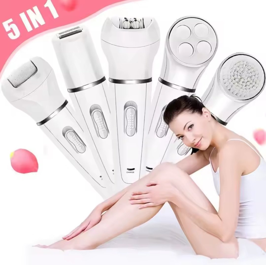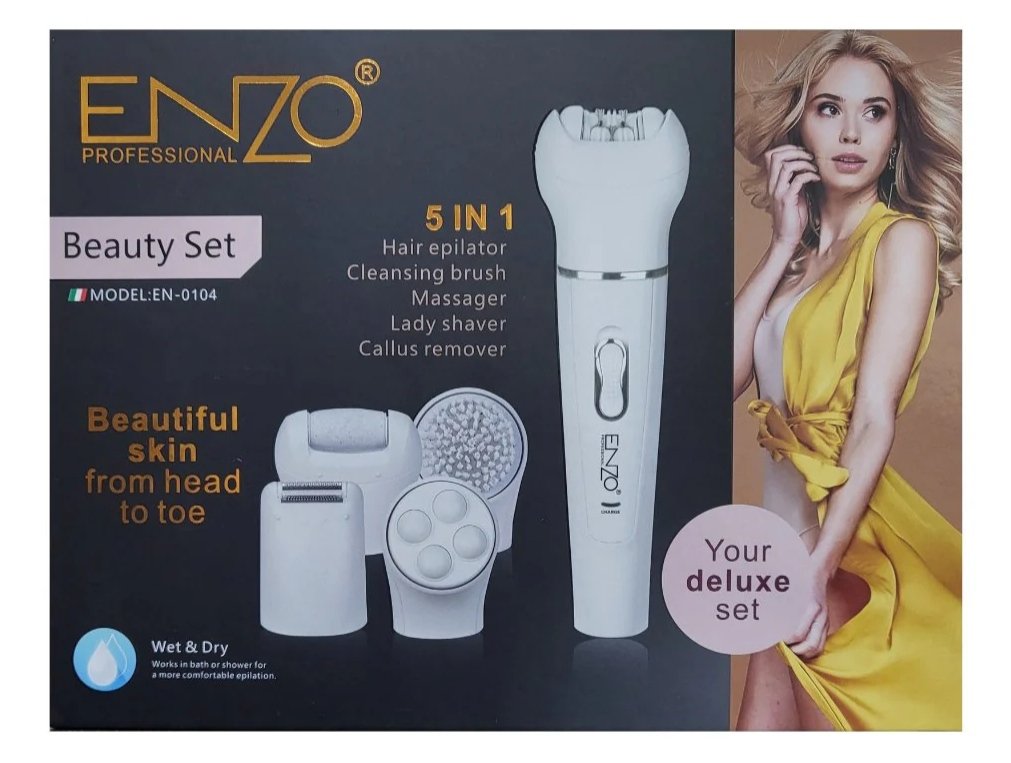 مجموعة العناية النسائية الاحترافية 5 في 1 من إنزو (موديل EN-0104) تجمع بين 5 أدوات أساسية للعناية بالجسم من الرأس إلى القدمين. تشمل المجموعة: مزيل الشعر الكهربائي، فرشاة تنظيف البشرة، جهاز تدليك، ماكينة حلاقة للسيدات، ومزيل الجلد القاسي. تعمل بتقنية Wet & Dry المناسبة للاستخدام الجاف أو تحت الماء، مما يوفر راحة ودقة عالية.