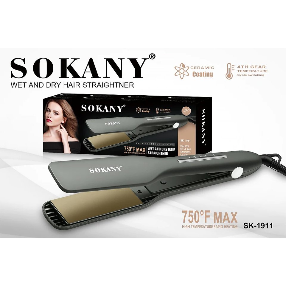 مكواة فرد شعر احترافية من سوكاني (موديل SK-1911) مصممة بطبقة سيراميك ناعمة وآمنة للاستخدام على الشعر الجاف والرطب. تعمل بتسخين سريع يصل إلى 750°F (حوالي 400°م) مع تقنية مضادة للحرق للحماية من الحرارة الزائدة. مثالية لتصفيف الشعر بسلاسة واحترافية في المنزل أو الصالون.